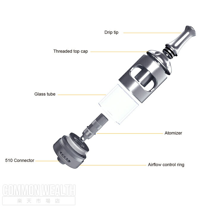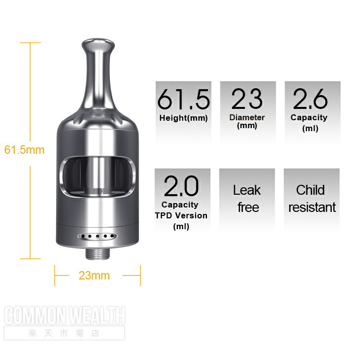 同封内容 Nautilus 2-Sアトマイザー本体 x 1 (1.8ohmコイルセット済み) ワイドボアショートドリップチップ x 1 スペアーガラスチューブ x 1 0.4ohmコイルユニット x 1 スペアーOリング x 9 保証書 x 1 ユーザーマニュアル x 1 (英文)