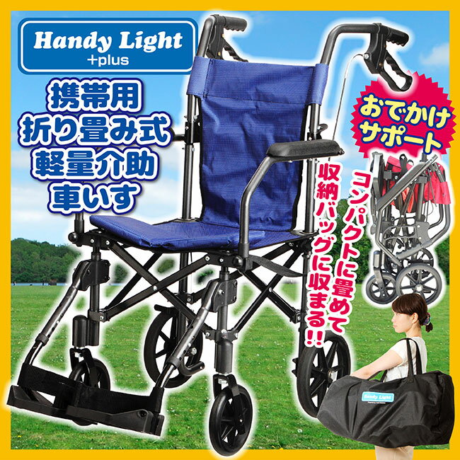 携帯用 折り畳み式軽量介助 車いす ハンディライトプラス Handy Light +plus おでかけサポート コンパクトに畳めて収納バッグに収まる!! 旅行に、お買い物に、安心ラクラクおでかけサポート! ●移動もラクラク バギー感覚で移動できます●安心の手元ブレーキ ブレーキロックも手元でできます●衝撃に強いクロスバーフレーム ネジレやユガミを最小限に抑えます●簡単に折りたためます 独自構造で超コンパクト●車の後部座席にもスッポリ 小さな車でも収納OK●持ち運びに便利なバッグ付 電車などにも持ち込めます ハンディライトは座位姿勢のスペシャリスト達が考えました 独自構造により、座るとゆったり、畳むと業界最小クラス!コンパクトさの中に充実の快適性能! □安心のロック機構付き手元ブレーキ。